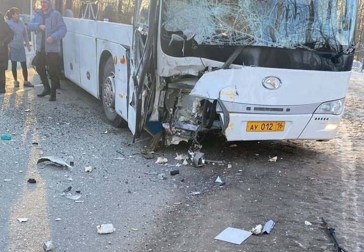 На въезде в Зеленодольск произошло серьезное ДТП с участием пассажирского автобуса и спецтехники. На опубликованных в соцсетях фото видно, что белый рейсовый автобус с госномерами Татарстана столкнулся с желтым экскаватором-погрузчиком.