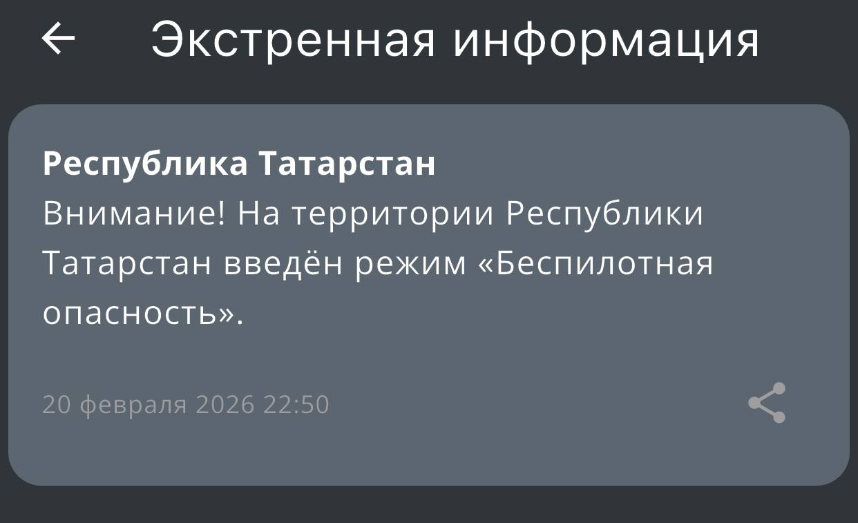 Это уже второй раз за день, когда в РТ объявляют «Беспилотную опасность». Ранее режим вводили в третьем часу ночи, и отменили его спустя пять часов