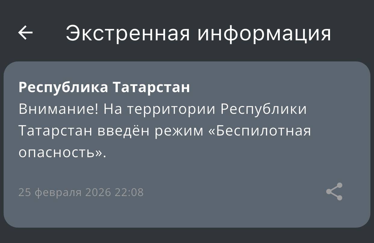 Напомним, что вчера в РТ также вводили режим беспилотной опасности, который сняли спустя пять часов. Также МЧС России сообщало о введении режима «Угроза атаки БПЛА» в Альметьевске, Нижнекамске, Елабуге и Заинске.
