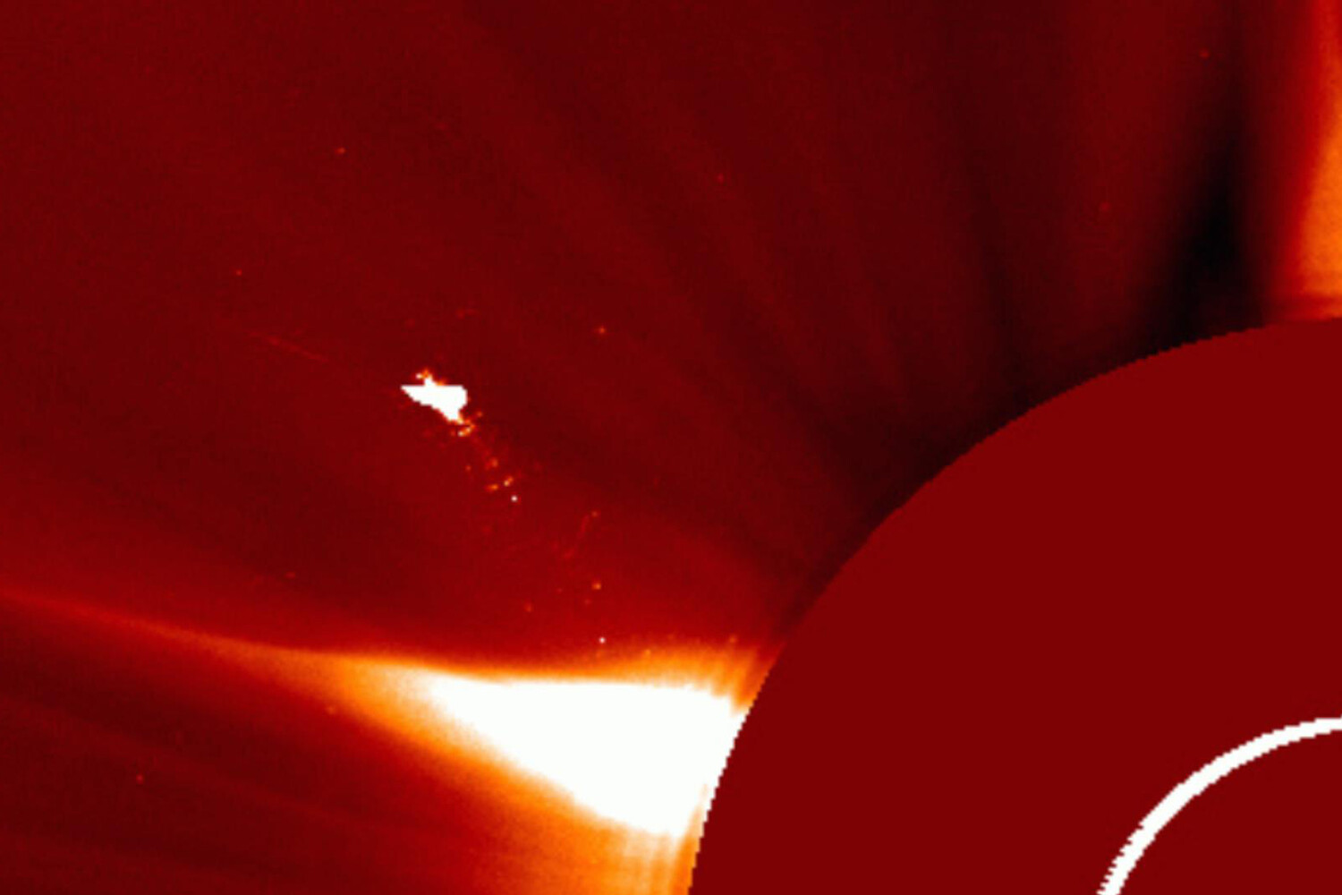 Изображение получили специалисты Лаборатории солнечной астрономии Института космических исследований РАН с помощью одного из телескопов LASCO. На фотографии отчетливо видны контуры, похожие на птицу или летательный аппарат с огненным шлейфом позади.