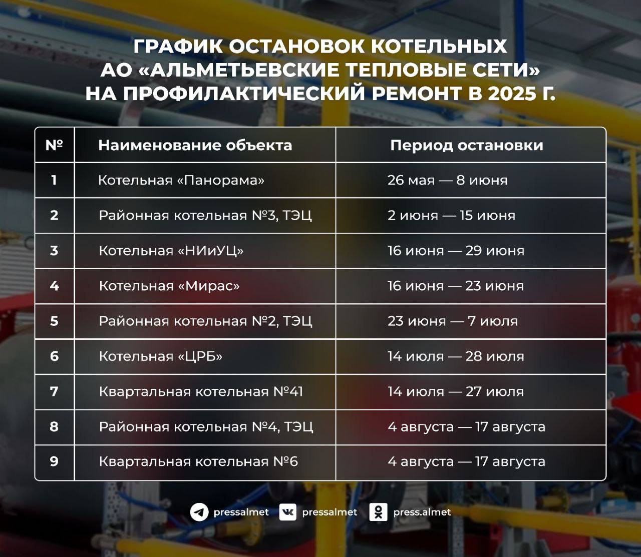Ограничения затронут девять объектов. График остановок работы котельных прилагаем.