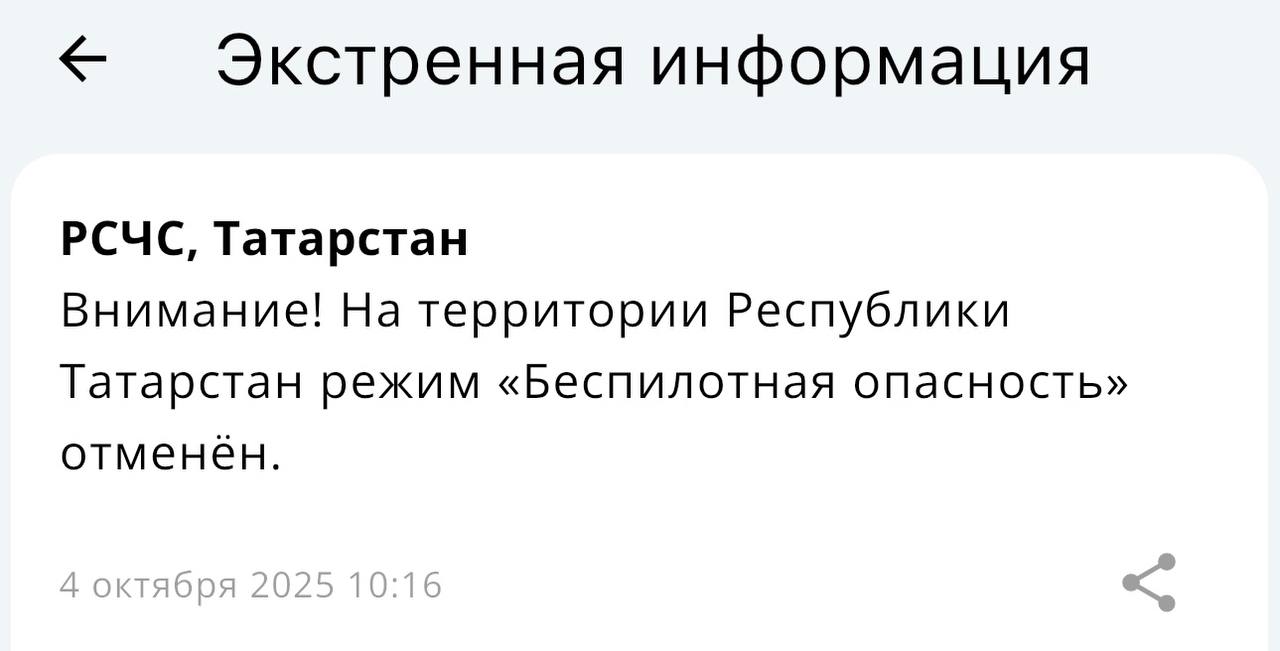 В Татарстане спустя семь часов сняли режим беспилотной опасности. Сообщение от МЧС России поступило в одиннадцатом часу утра.