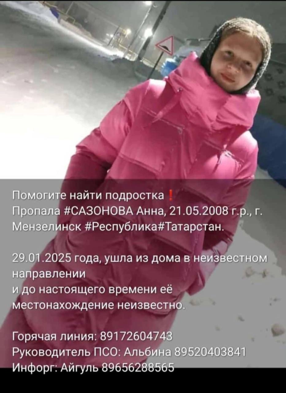 В Татарстане в городе Мензелинск пропала 16-летняя Анна Сазонова. Сообщается, что 29 января девушка вышла из дома в неизвестном направлении, и до настоящего времени о её местонахождении ничего неизвестно.