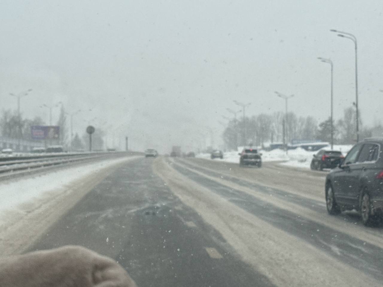 На кадрах видно, как снежная буря бушует на дороге. Видимость на трассах крайне ограничена, водители едут медленно.