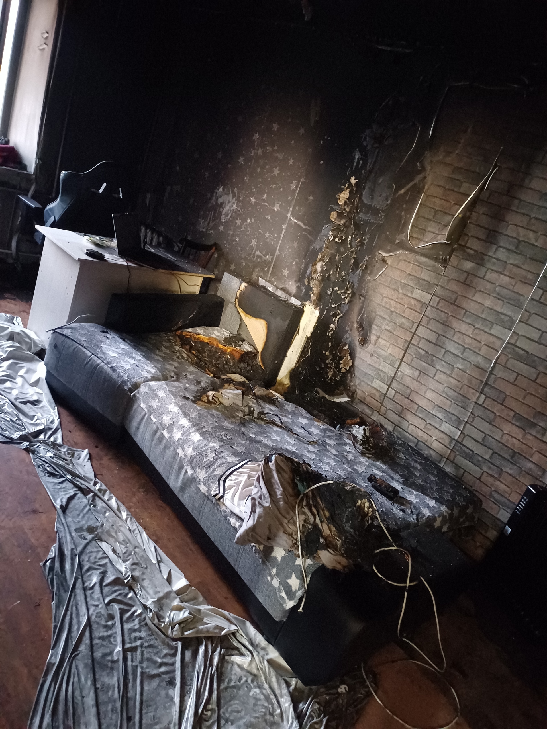 Челнинка пишет, что огонь уничтожил практически все содержимое комнаты. Сгорели школьные учебники, одежда, ноутбук, принтер, мебель, диван. Пострадали потолок, обои, даже часть посуды не уцелела. Квартира наполнилась едким дымом.