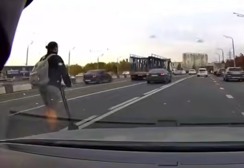 В Казани на видеорегистратор участника движения попал водитель самоката, который на большой скорости двигался прямо по проезжей части, маневрируя среди других машин.