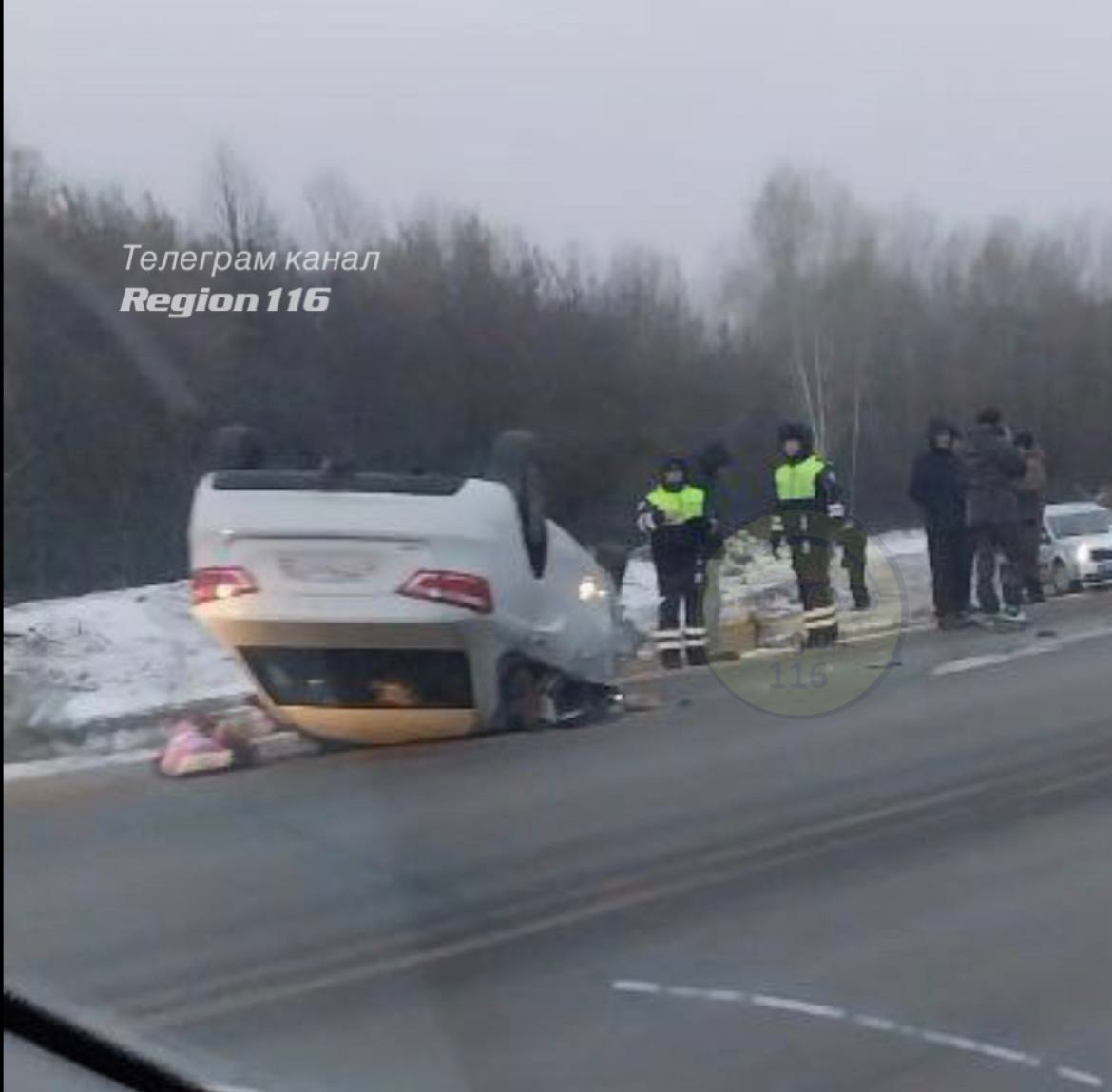 В Лаишевском районе Татарстана произошло ДТП, в результате которого перевернулась легковушка. Очевидцы опубликовали видео с места происшествия.