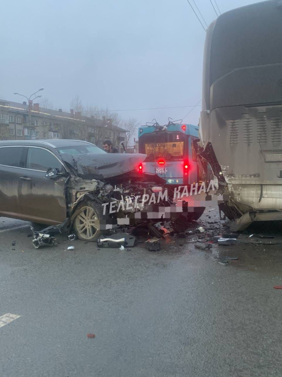 На кадрах видно, что из-за столкновения серьезно пострадали три автомобиля. Один из них врезался в автобус. У автомобиля полностью смят капот и разбиты фары. На проезжей части разбросаны части авто. Также пострадал автобус: у него разбита левая фара и смята левая часть.