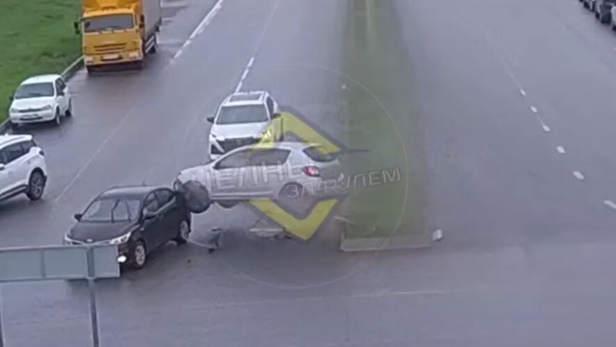 Снес знак и влетел в авто: необычное ДТП в Набережных Челнах попало на видео