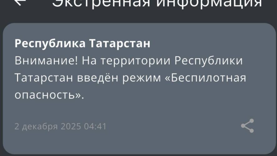 Режим беспилотной опасности введен в Татарстане ночью во вторник, 2 декабря. Сообщением с предупреждением пришло от МЧС России в 04:41.
