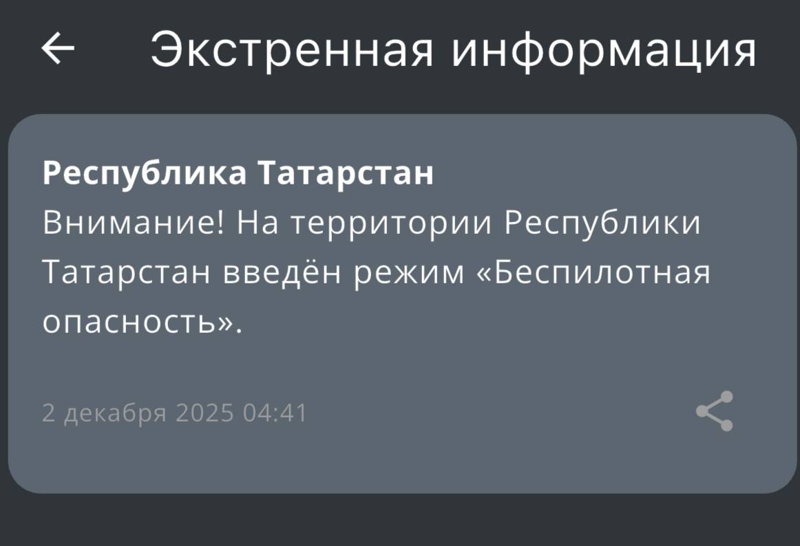 Режим беспилотной опасности введен в Татарстане ночью во вторник, 2 декабря. Сообщением с предупреждением пришло от МЧС России в 04:41.