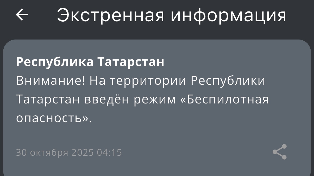 Режим беспилотной опасности вновь объявлен в Татарстане. Сообщение от МЧС России пришло в 4:15.