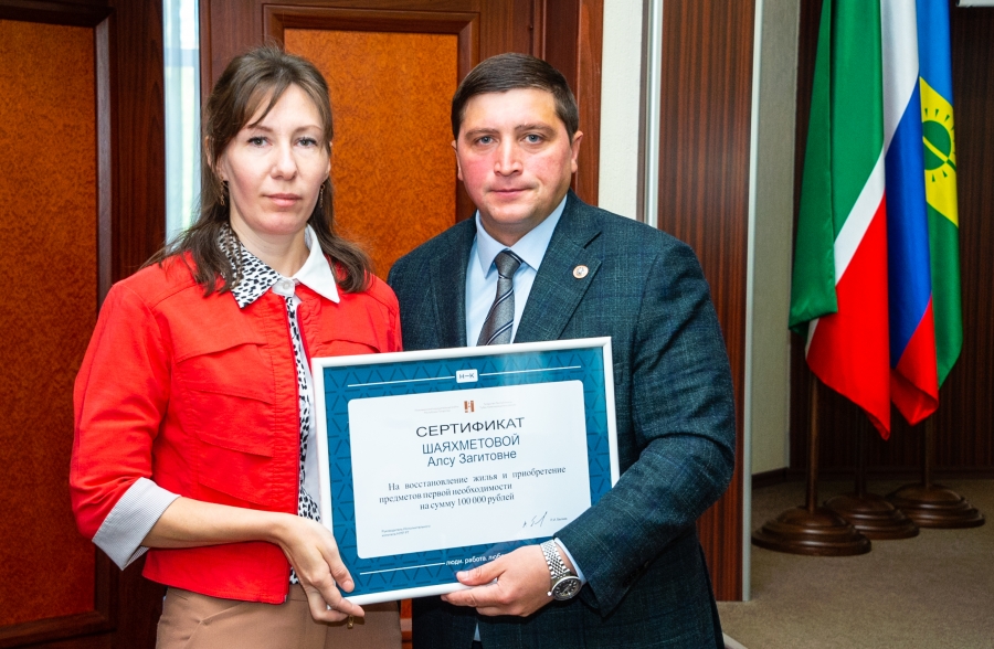Сертификаты на сотни тысяч рублей для восстановления жилья после пожаров вручил двум нижнекамским семьям руководитель исполкома района Радмир Беляев. Сделал он это на деловом понедельнике.