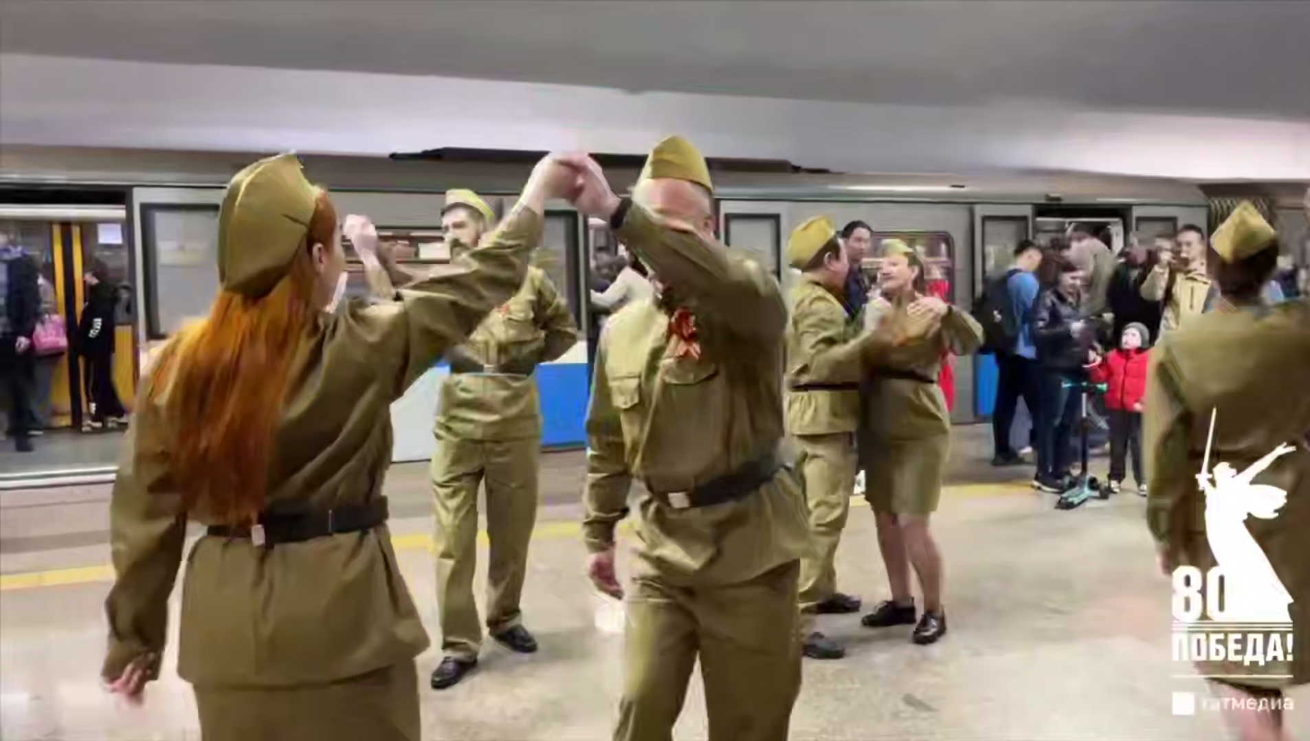 Работники МУП «Метроэлектротранс» присоединились к празднованию 80-летия Великой Победы и исполнили танец для казанцев и гостей города. Они танцевали в военной форме на станции «Кремлёвская».