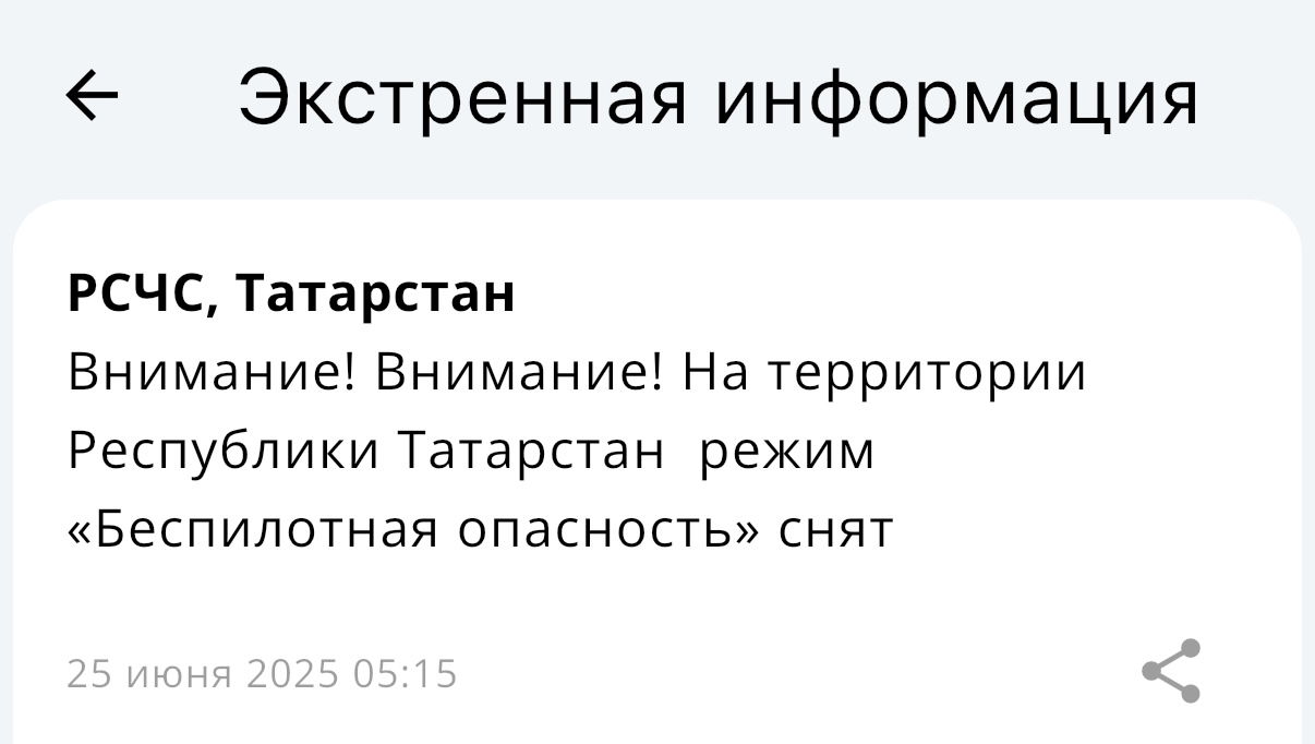 В Республике Татарстан снят режим «Беспилотная опасность». Соответсвующее сообщение пришло в шестом часу утра от МЧС России.