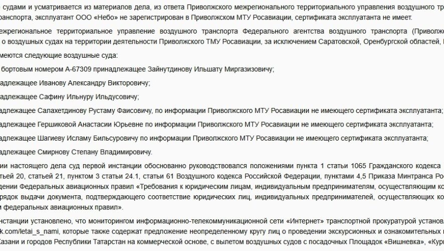 Установлено, что ни у кого бы то ни было из физических лиц, ни у образованного юридического лица в виде ООО «Небо», не было сертификата эксплуатанта для осуществления коммерческих воздушных перевозок. Это подтверждается информацией Приволжского МТУ Росавиации.