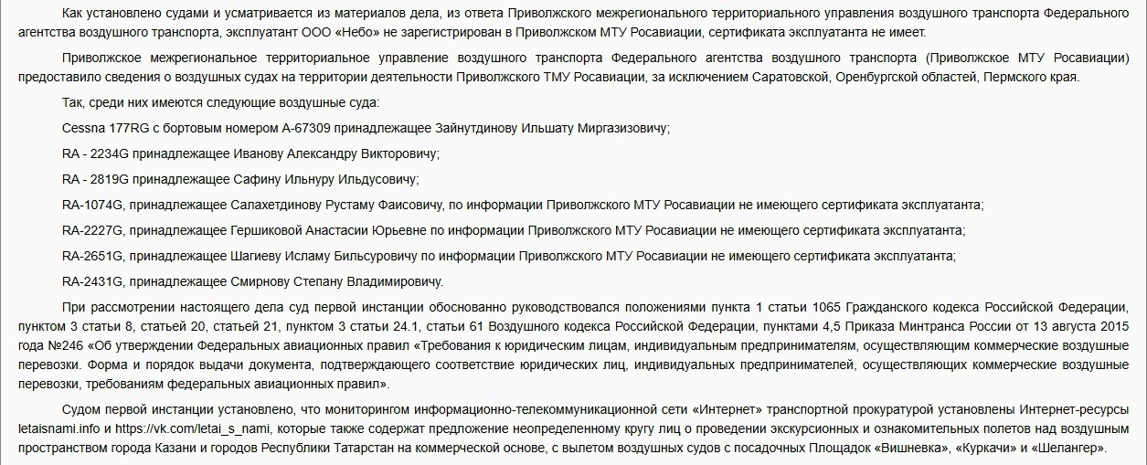 Установлено, что ни у кого бы то ни было из физических лиц, ни у образованного юридического лица в виде ООО «Небо», не было сертификата эксплуатанта для осуществления коммерческих воздушных перевозок. Это подтверждается информацией Приволжского МТУ Росавиации.