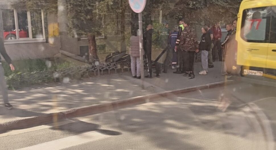 На кадрах видно, что мотоцикл полностью опрокинулся и вылетел за изгородь возле здания. На месте собралось много людей. Также рядом с места происшествия стоит бригада скорой помощи.