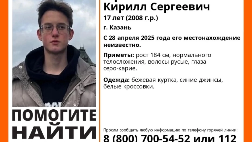 С конца апреля в столице Татарстана ищут пропавшего 17-летнего Кирилла Орлова. Об этом сообщается на официальной странице поискового отряда «ЛизаАлерт» Республики Татарстан.