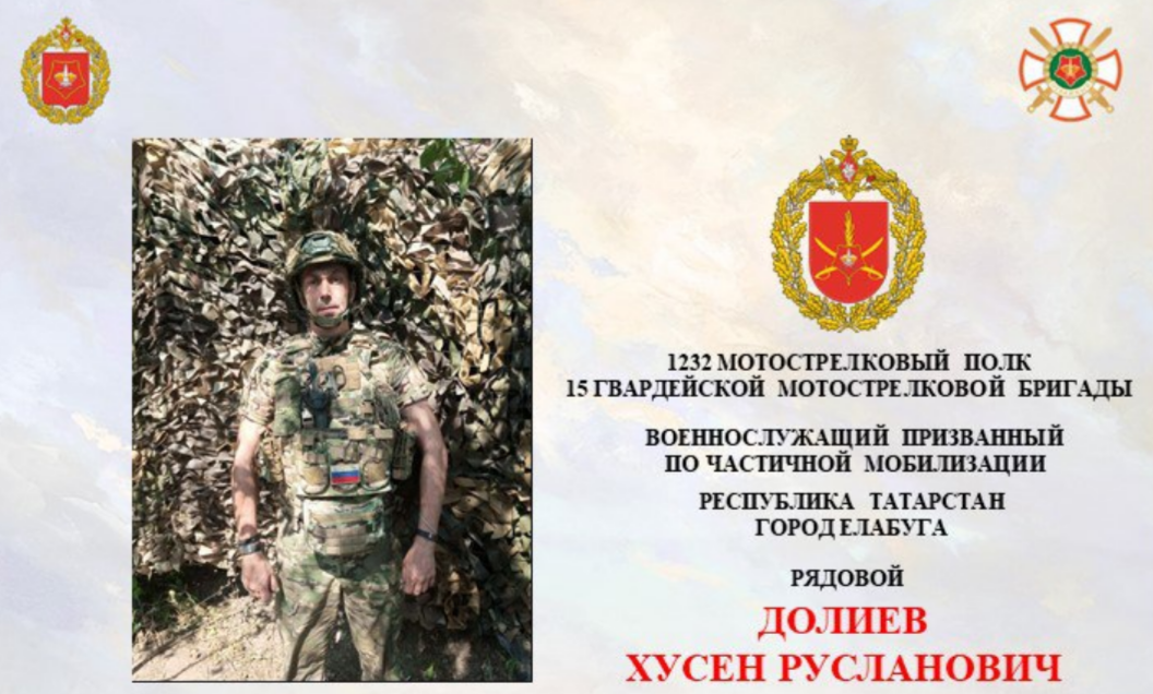 Елабужанин Хусен Долиев, призванный по частичной мобилизации на СВО, с 29 сентября 2022 года выполняет задачи в составе группировки войск «Центр». За проявленное мужество и самоотверженность во время боевых действий он был награжден медалью «За отвагу», сообщает «Татар-информ».