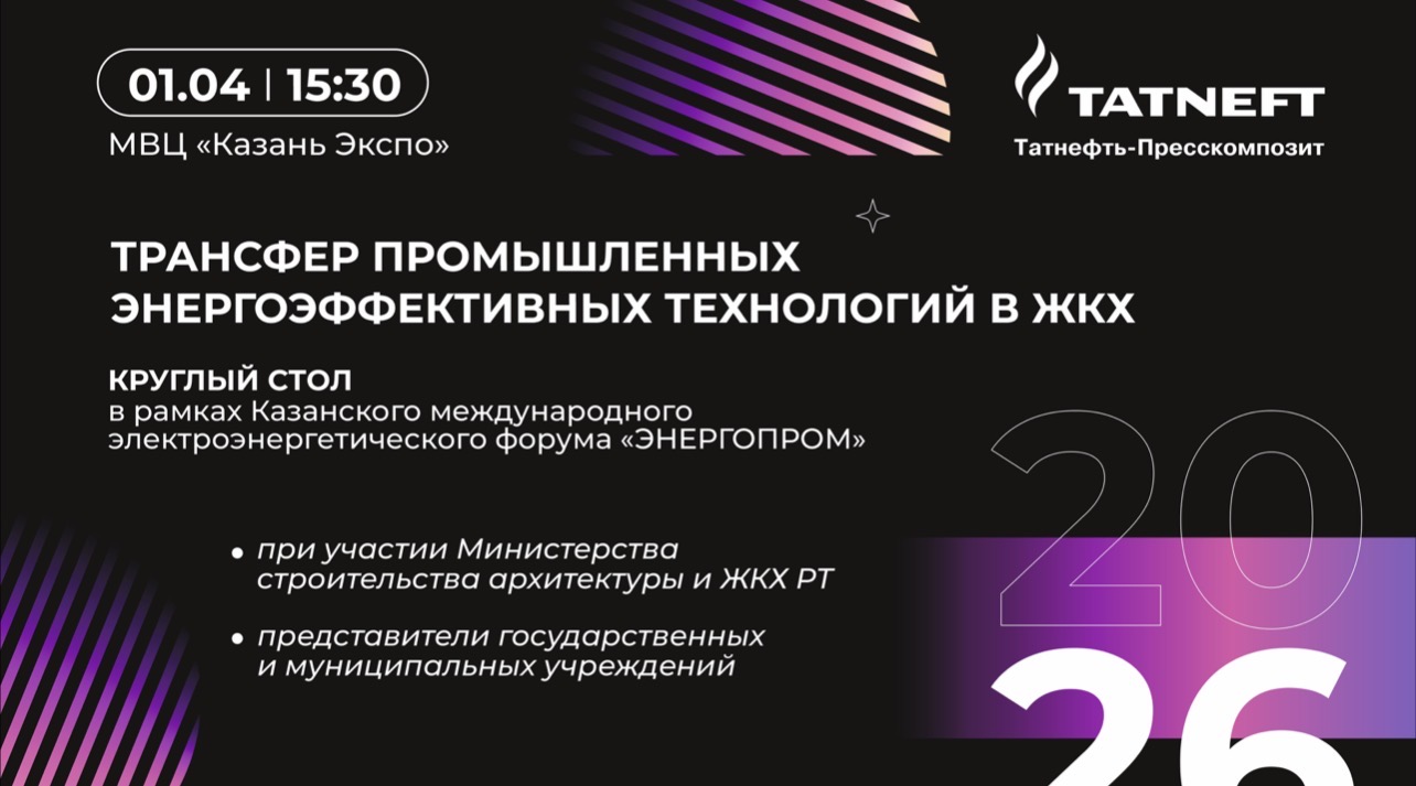 Организатором круглого стола «Трансфер промышленных энергоэффективных технологий в ЖКХ» выступает компания «Татнефть-Пресскомпозит».