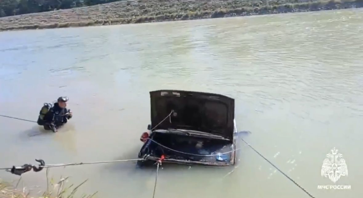 На кадрах видно, что минивэн вытаскивают из воды с помощью лебедок. Возле авто работают водолазы.