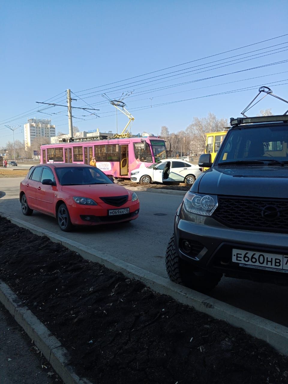 В Набережных Челнах из-за ДТП с легковушкой встали трамваи. Очевидцы поделились фото с места происшествия.