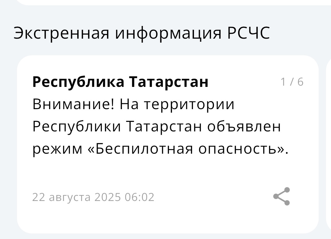В пятницу, 22 августа, рано утром в Татарстане вновь был введен режим беспилотной опасности. Сообщение от МЧС России пришло в седьмом часу.