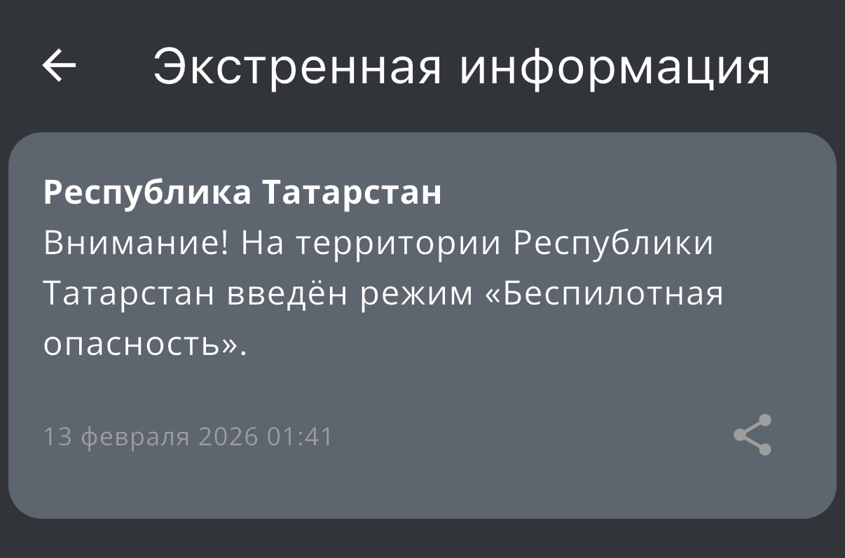 Режим беспилотной опасности вновь введено в Республике Татарстан. Сообщение с предупреждением поступило от МЧС России в 01:41.