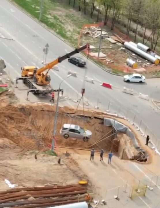 Машину, провалившуюся в котлован в Казани, достали при помощи крана. Видео подъема появилось в социальных сетях.