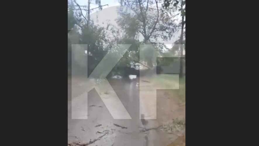 Из-за ураганного ветра большое дерево упало прямо на проезжую часть и полностью перекрыло её. Предположительно, ствол дерева повалился на ж/д пути.