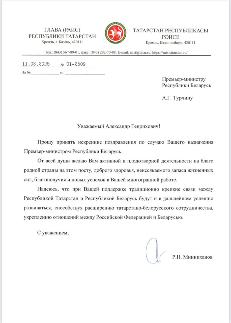 Раис Республики Татарстан Рустам Минниханов направил поздравление премьер-министру Республики Беларусь Александру Турчину. Соответствующая телеграмма появилась на сайте пресс-службы раиса РТ. Вчера в Белоруссии был подписан указ о назначении Турчина премьер-министром.