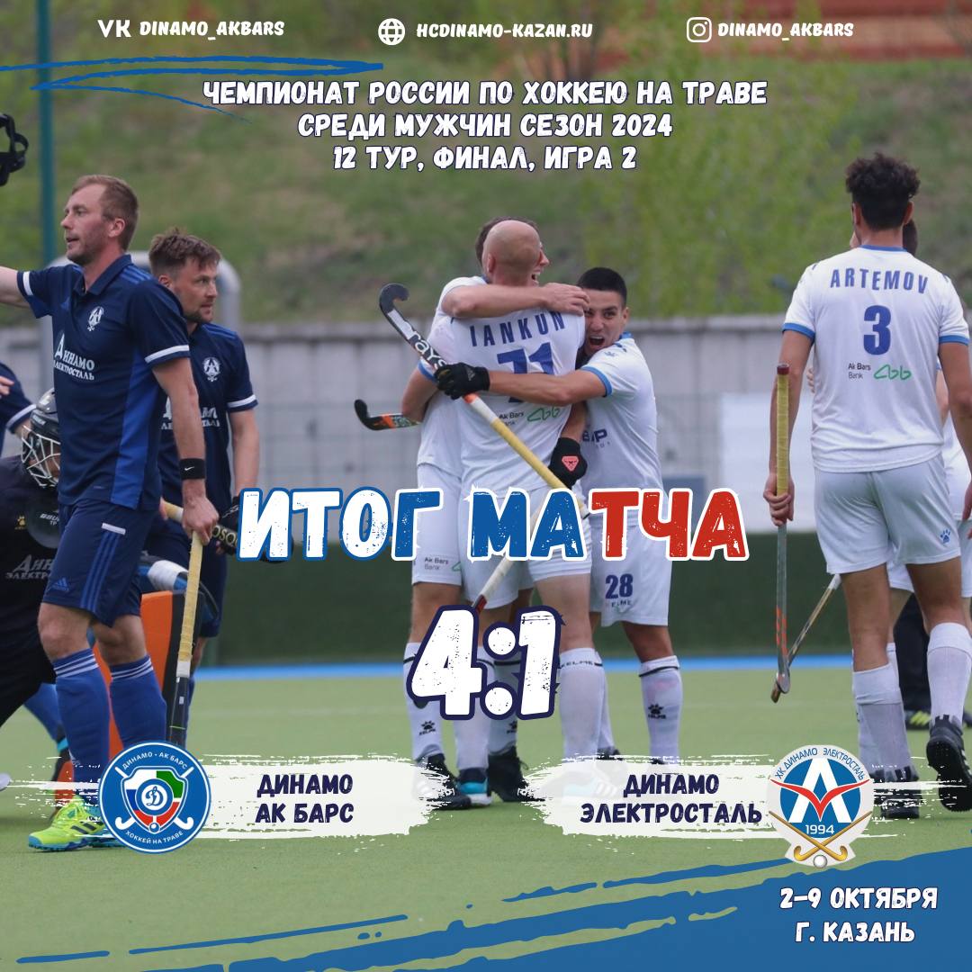 Казанское «Динамо-Ак Барс» победило на своем поле «Динамо-Электросталь» во втором финальном матче плей-офф чемпионата мужской российской Суперлиги по хоккею на траве. Победу команда одержала со счетом 4:1, и в 22-й раз стало чемпионом страны. Об этом клуб сообщил в своих социальных сетях.