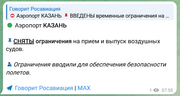 В аэропортах Казани и Нижнекамска сняли временные ограничения, об этом сообщает Росавиация. Ограничения вводились для обеспечения безопасности полетов.