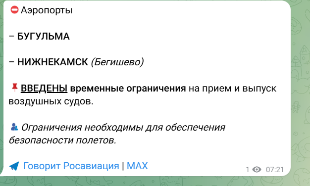 В аэропортах  Бугульмы и Нижнекамска введены временные ограничения на прием и выпуск воздушных судов. Об этом сообщает Росавиация.
