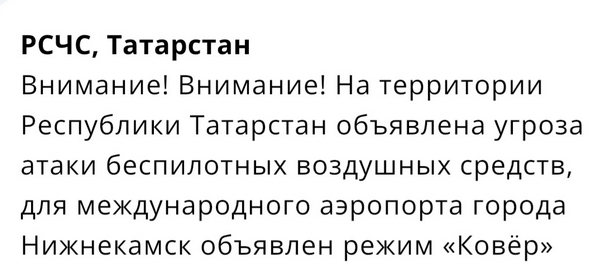 Из-за угрозы атаки вражеских беспилотников в аэропорту Нижнекамска объявили режим «Ковер». Кроме того, по данным Росавиации, для обеспечения безопасности полетов в «Бегишево» ввели временные ограничения на прием и выпуск воздушных судов.