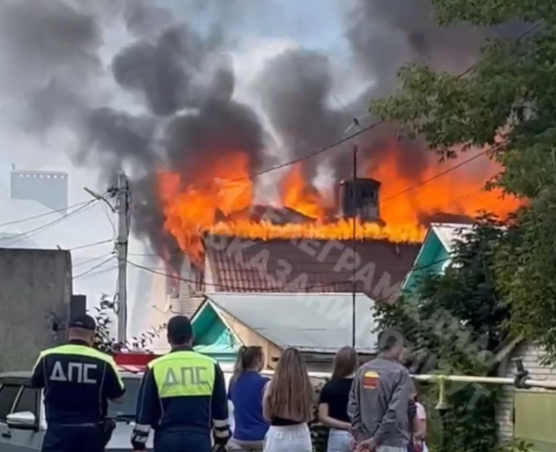 На кадрах видно, что пламя полностью покрывает крышу здания, мощное горение наблюдается на втором этаже дома.