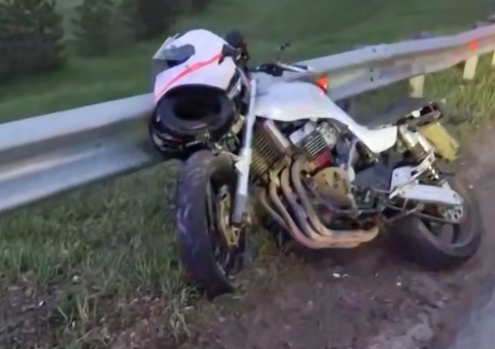 На кадрах видно, что мотоцикл получил не слишком серьезные повреждения. Тем не менее на место прибыла карета скорой помощи.