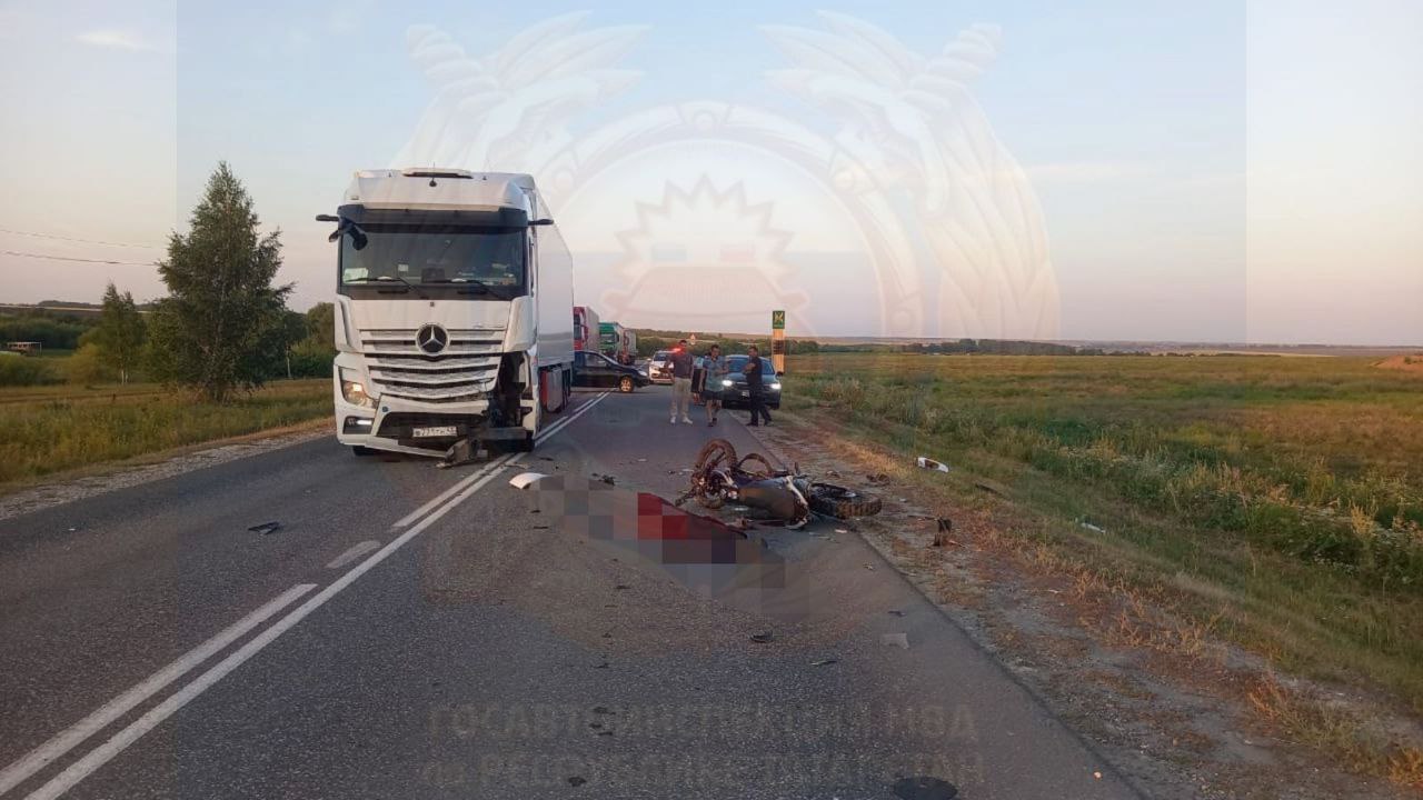 Водитель мотоцикла Honda Integra ZX слишком разогнался, вылетел на встречную полосу и врезался в грузовик Mercedes. За рулём фуры был 55-летний мужчина, пишет Госавтоинспекция Татарстана.