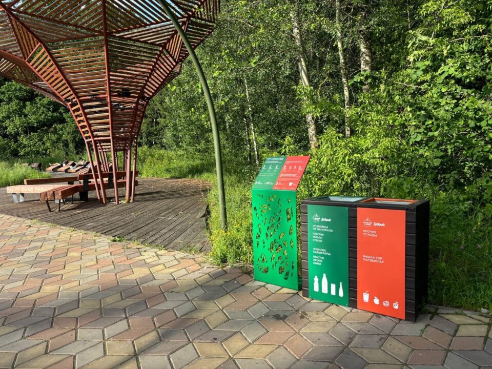 Урны выполнены из инновационного полимернопесчаного композита с добавлением вторичного пластика. Рядом с некоторыми из них установлены информационные стенды, помогающие посетителям правильно сортировать отходы.