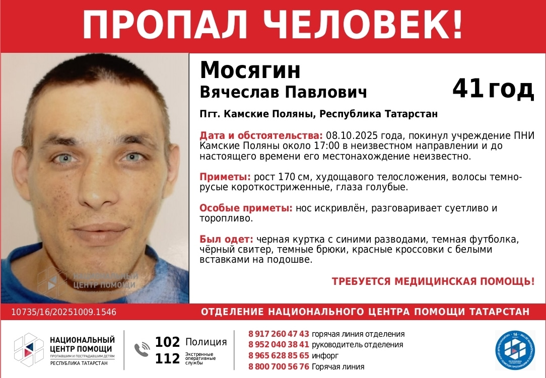 В поселке городского типа Камские Поляны Республики Татарстан ведется поиск 40-летнего Вячеслава Павловича Мосягина, 1984 года рождения. Мужчина покинул психоневрологический интернат (ПНИ) Камские Поляны 8 октября 2025 года около 17:00 и с тех пор его местонахождение неизвестно.