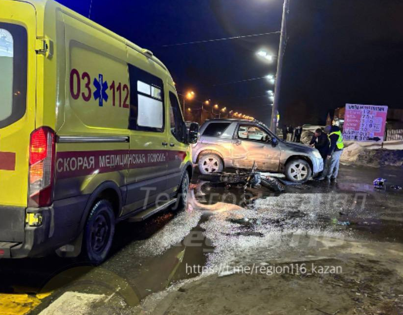 В Казани произошла авария с участием питбайка и легкового автомобиля. Соответствующей информацией в соцсетях делятся местные жители.