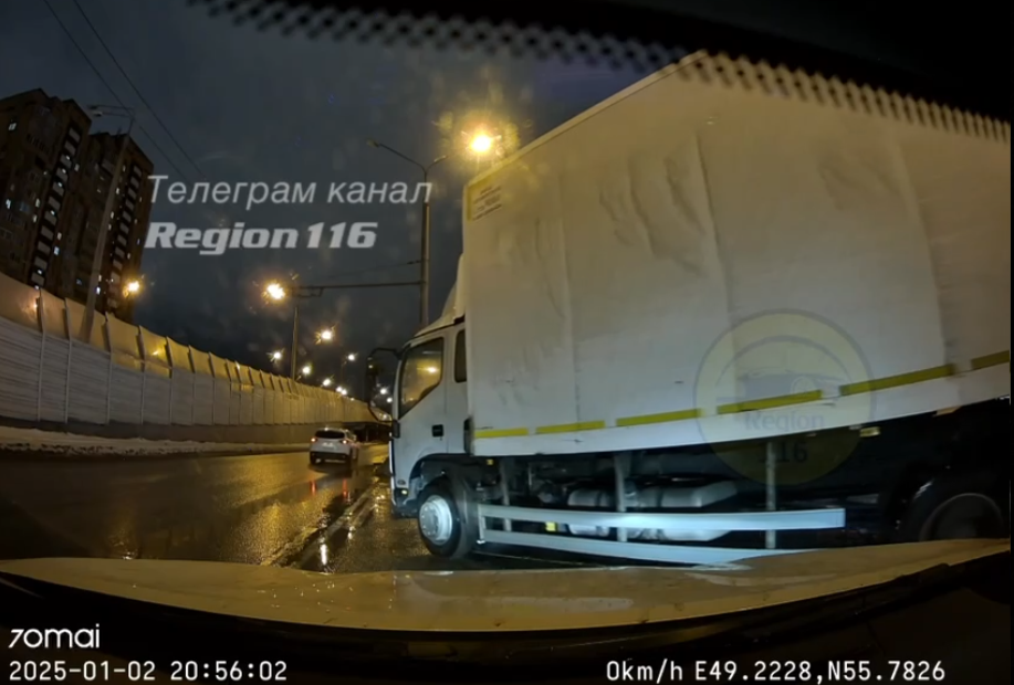 В Казани на улице Сахарова грузовая фура чуть не снесла остановку во время выезда с парковки. Очевидцы опубликовали видео с моментом происшествия.
