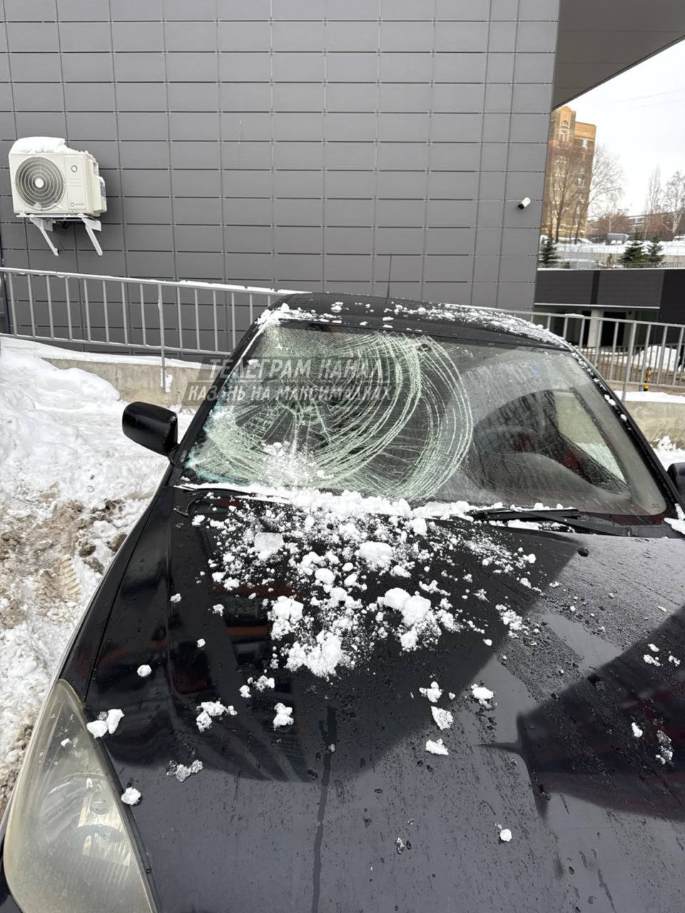 В Казани в жилом комплексе «Легенда» с крыши одного из домов сошла крупная глыба льда, которая упала на припаркованную машину. Об этом сообщают очевидцы в социальных сетях.