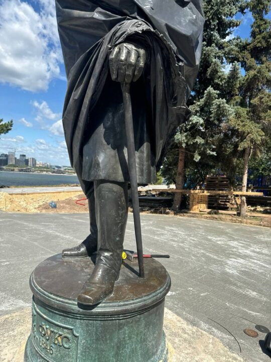 Так, трость вернули обратно и прикрепили её надежнее, чем в прошлый раз. За порядком в сквере после открытия будут бдительно следить камеры, так что просим воздержаться от проверки прочности трости.