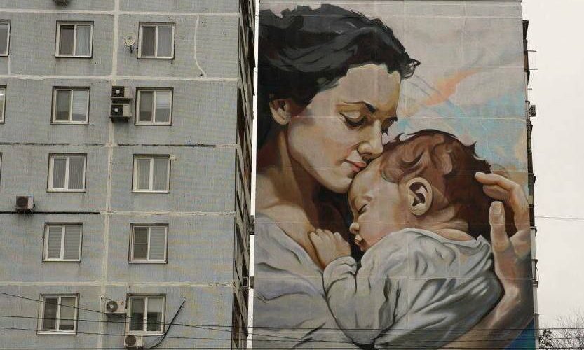 На фасаде жилого дома на улице Адоратского в Казани появилось масштабное изображение первой встречи матери и ребёнка. Мурал разместили прямо напротив перинатального центра — так, чтобы роженицы могли видеть его из окон, пишет kazan-news.ru.