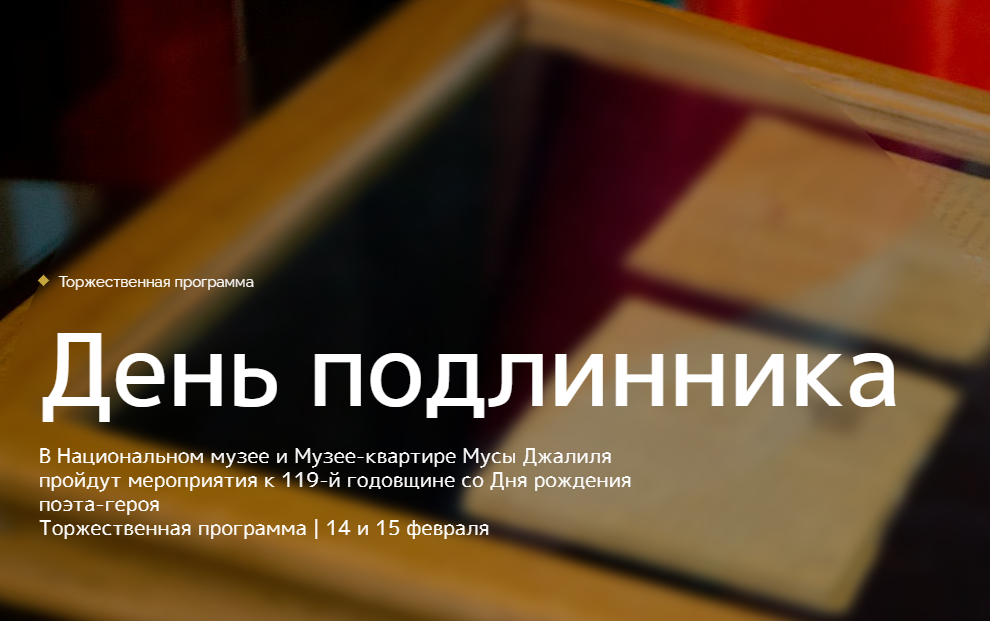 Сегодня, 15 февраля, программа начнется в 11:00 с возложения цветов к памятнику поэта-воина на Площади 1 мая. В 12:00 в Национальном музее пройдет традиционный «День подлинника». В рамках ежегодной акции оригинал «Моабитских тетрадей» Мусы Джалиля торжественно вынесли из фондов музея и установили в специальной витрине. Жители и гости Казани получат редкую возможность увидеть подлинный сборник стихов, написанный поэтом в берлинской тюрьме Моабит.
