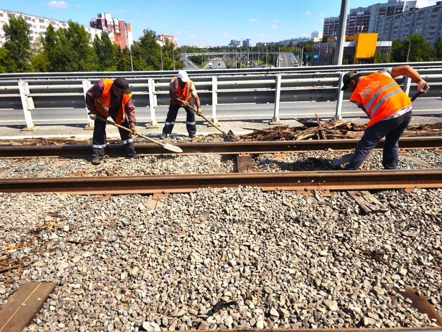 Помимо масштабных работ, сотрудники службы ежедневно занимаются поддержанием трамвайного полотна в надлежащем состоянии, в том числе проводят покос травы и вырубку кустарников вдоль путей.