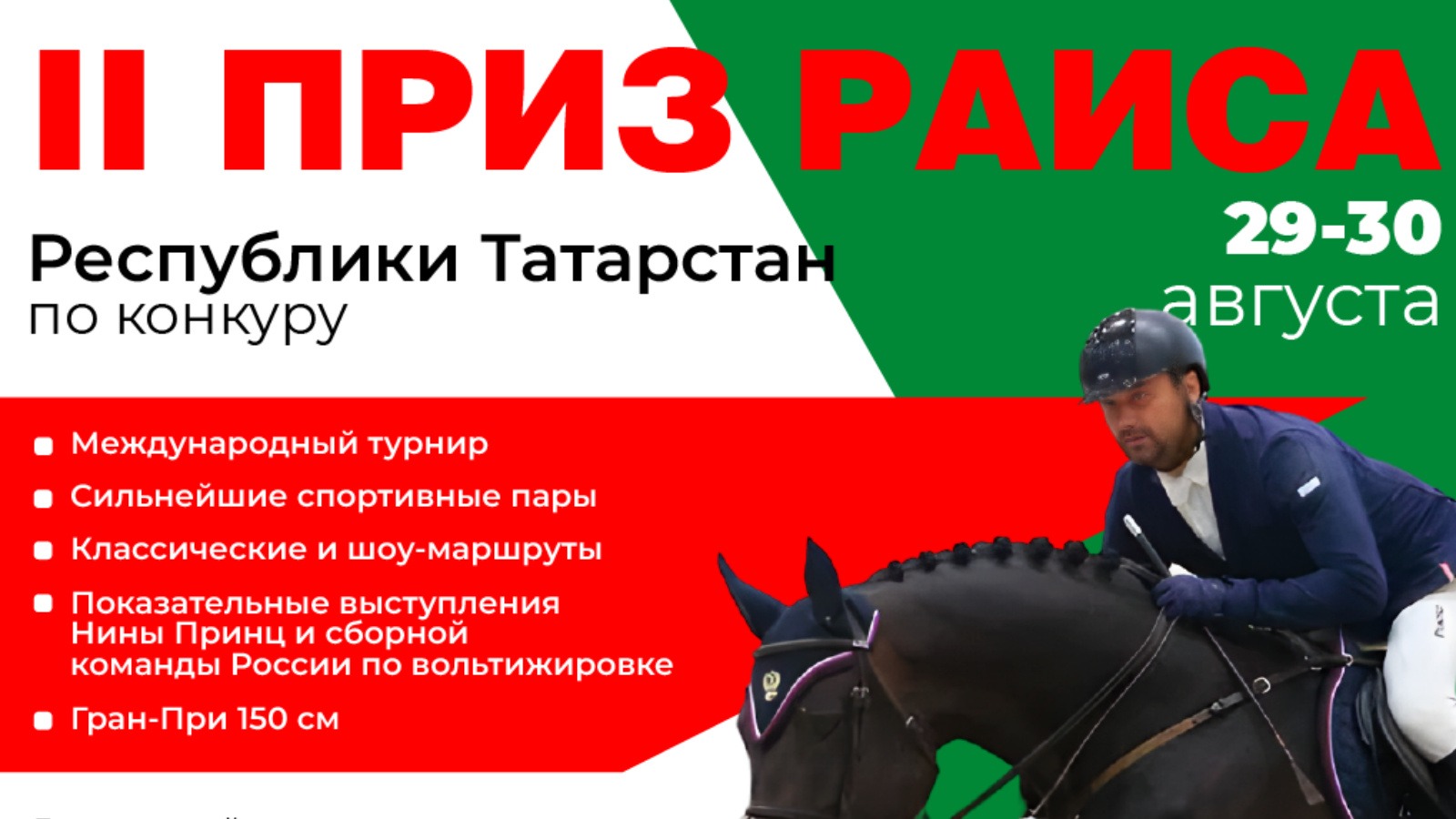 В этом году Казань во второй раз примет масштабный международный турнир по конному спорту – Приз раиса Республики Татарстан. Соревнования по конкуру пройдут 29 и 30 августа, приуроченные к празднованию Дня Республики Татарстан и Дня города Казани. Об этом сообщили в пресс-службе министерства спорта РТ.