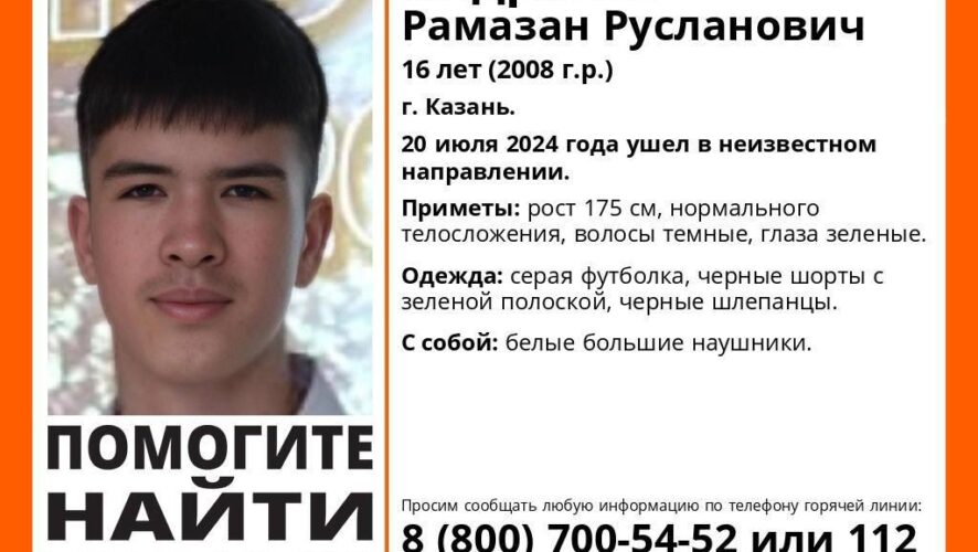 Сообщается, что ученик одной из казанских школ Рамазан Кидрясов ушёл в неизвестном направлении в субботу 20 июля. До этого он находился в Дербышках.